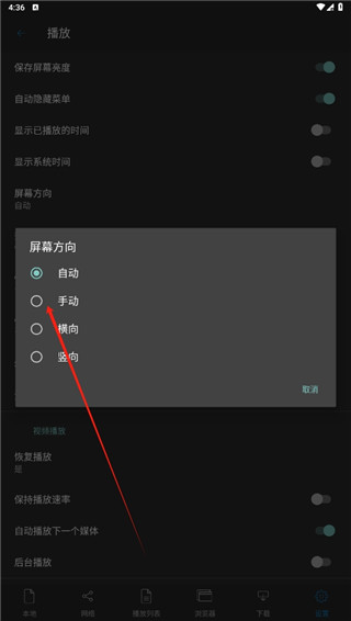 3、最后在播放中,点击屏幕方向,选择你需要的方向完成设置即可