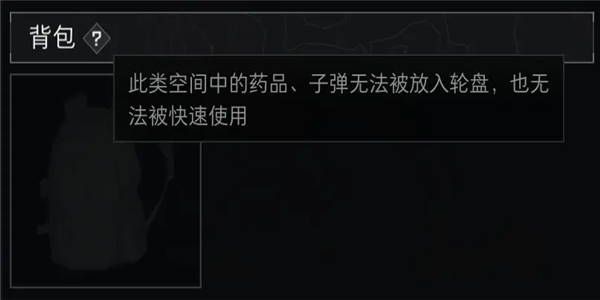 这两者的区别在于,放置于背包中的子弹和补给物资无法通过快捷轮盘使用,必须要打开背包放置到胸挂或者口袋部位才能使用。
