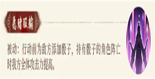 被动:行动前为敌方添加骰子,持有骰子的角色阵亡时我方全体攻击力提高。