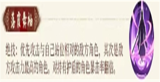 绝技:优先攻击与自己站位相对的敌方角色,其次是敌方攻击力最高的角色。对持有护盾的角色暴击率翻倍。