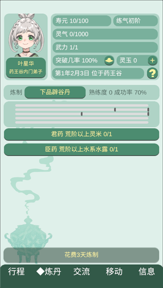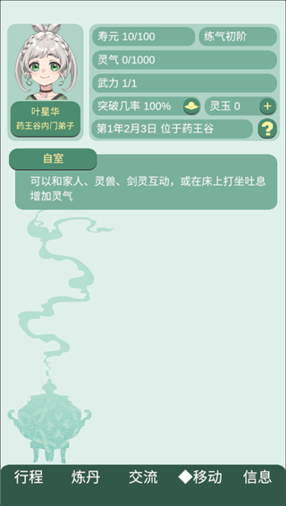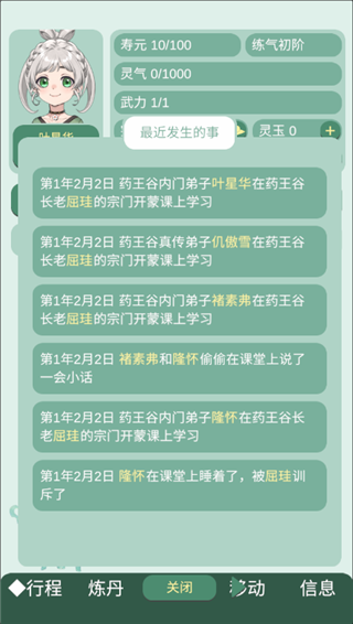 在药王谷女修修炼手札最新版中的玩法也是非常简单,通过点击行程的方式就能发展剧情,每个事件都是随机的,运气好的话还能学习品质较好的功法,轻松提升自己的实力,而且你还能随时看到人物的各项属性,寿元、灵气、武力、突破几率、灵玉、练气阶段等等。