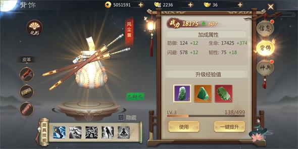 在背饰面板,我们可以对背饰进行升级,化形,隐藏。每个等级都有对应的技能等级解锁,获得强大的技能效果,可以让你在江湖中如鱼得水。