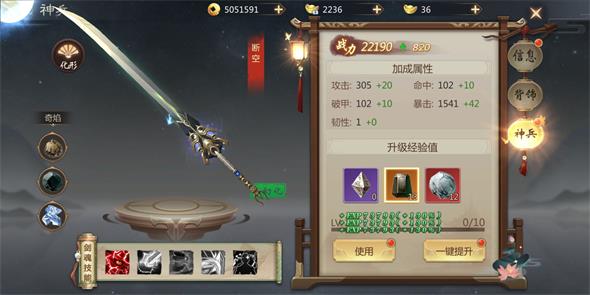在神兵系统面板,我们可以对神兵进行升级,化形,隐藏。每个等级都有对应的技能等级解锁,获得强大的技能效果,可以让你在江湖中如鱼得水。