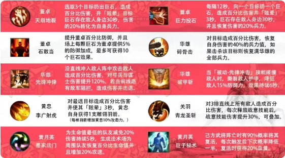 当然,肉归肉(血量、防御能力强),但董卓也并非是真的杀不死。因此为了不让我们这位阵容核心开局就被敌人集火,我们可以搭配华雄,利用他的「被动-先锋冲击」在开局直接冲散敌人的阵型站位,并配合「被动-破甲斩」降低敌人的防御来提高队伍的整体输出能力。