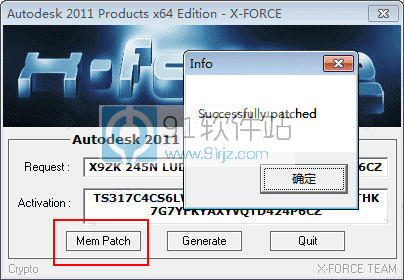 12、点击Generate算出激活码,在注册机里点Mem Patch键弹出“successfully patched”就可以激活;