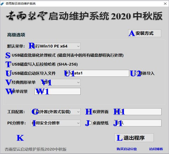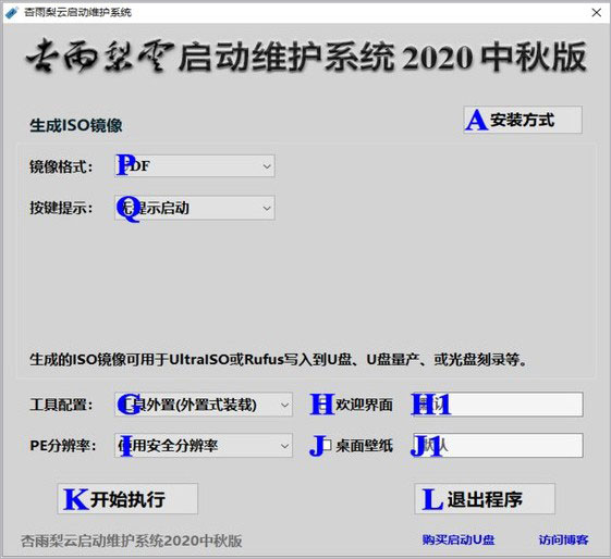 A、安装方式安装到USB磁盘、安装到本地磁盘、生成ISO镜像、高级选项、关于程序。