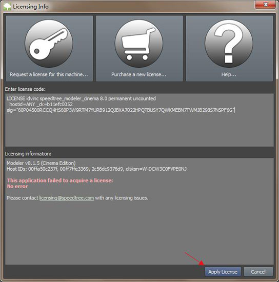 7、安装完成后运行软件,将数据包中SpeedtreeLic.txt文件里的激活码复制到软件上然后点击apply license即可