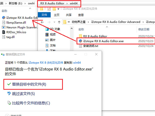 8、完成以上文件复制替换之后,在返回汉化文件夹,将“iZotope RX 8 Audio Editor.exe”文件复制到软件安装的路径下,并进行替换,如下图;