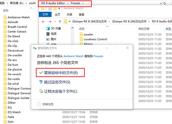 7、接着对iZotope rx8进行汉化破解,打开解压之后的汉化文件夹,在打开“RX 8 Audio Editor”文件夹,找到presents文件夹,再将最里面的44个文件夹复制到软件安装的【RX 8 Audio EditorPresets】路径下,替换原来的文件,如下图;