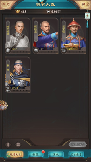 1、大臣:大臣的属性是国力的重要组成部分;在翰林院培养大臣是提升国力的最快速方法;在大臣的基础信息中,我们可以看到,大臣的属性有基础属性,联盟加成,官品加成,珍宝加成以及清帝光环加成。