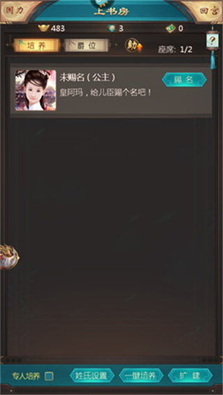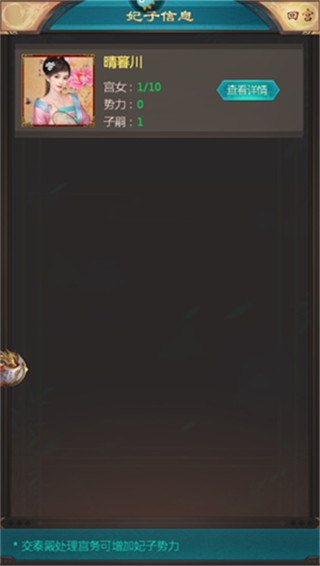 3、子女:培养子女获得的属性和妃子的亲密度有关;一般亲密度越高的妃子,所生的皇子等级属性越高。联姻可以获得亲家子女的属性,加入到自己的国力中;如果能和大佬联姻,国力就会飞速上涨。