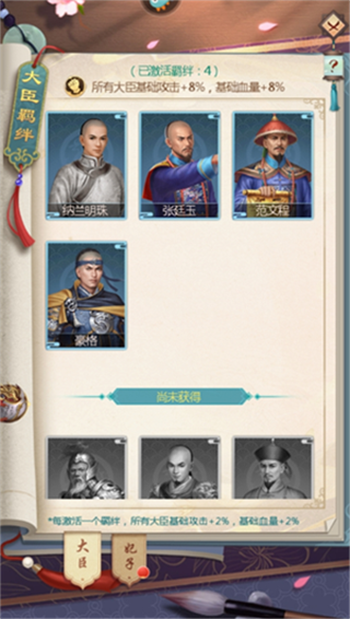 6、提升羁绊:大臣与妃子的羁绊激活可以获取百分比的属性加成,国力可以在此获得大幅度提升。