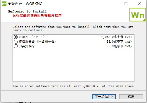 2、运行setup.exe,选择WorkNC 2021,阅读软件许可协议,勾选我接受协议