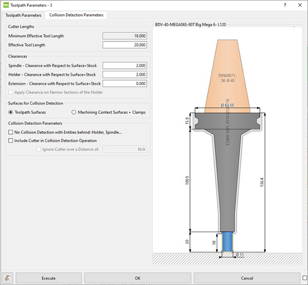 对于每个单独的操作,可在“刀具路径参数”对话框的“碰撞检测参数”选项卡中找到碰撞模型的定义。
