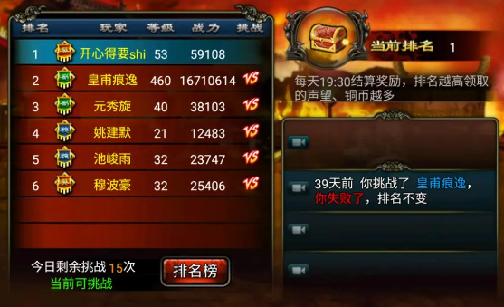 PVP系统就此开放!排名越高奖励越丰厚。每日有15次挑战机会,就算失败也有声望与铜币奖励,因此建议每日用满。
