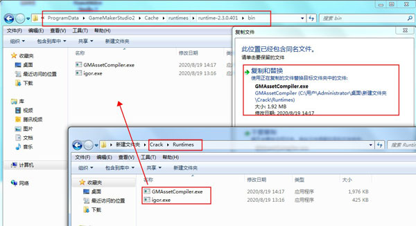 10、 将Crack中Runtimes下的"GMAssetCompiler.exe"和"igor.exe"复制到【C:ProgramDataGameMakerStudio2Cacheruntimes runtime-xbin】,其中X是安装的版本