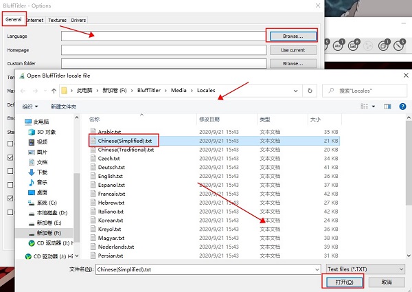 8、在弹出框中依次选择Language-Browse,之后在文件选择中Chinese(Simplified).txt,点击打开,点击OK保存设置