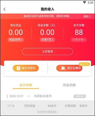 2、想要提现除了要将金币兑换成现金以外,在预估现金的下面可以【查看】,如果满足条件,则可以立即提现。