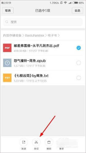 1、我们点击选择手机本地文件夹中的一个电子书文件,如图所示然后点击剪切或者复制;