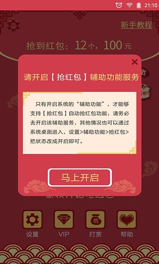 开启自动抢红包服务,好运抢红包将全程监控红包消息,绝不遗漏任何一个红包。