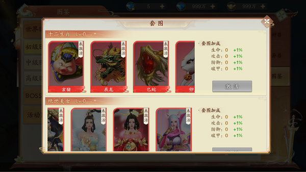 图鉴收集也是不容小觑的,在不断提升实力的同时还可以满足玩家的收集癖~比如我们的十二生肖套图、天宫绝世美人套图、十二星座套图、道法上仙套图以及后面更多套图等你探索!