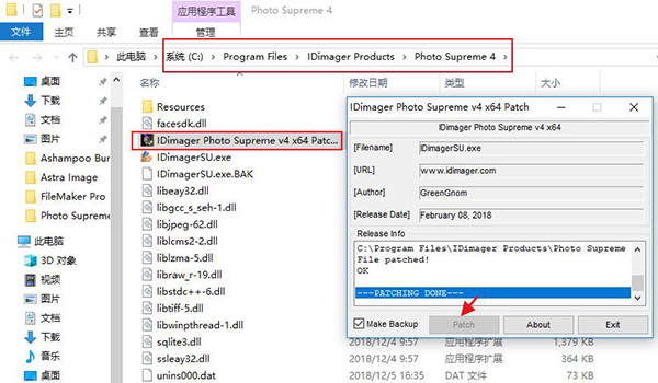 6、安装完后将注册机复制到C:Program FilesIDimager ProductsPhoto Supreme 4目录下并运行,点击patch即可破解