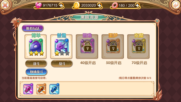 2、黑暗浪潮15级开启,每日0点重置,每天可打三次,如果通关3颗星就可以选择快速战斗,略过战斗过程为你节省更多时间。建议选择与自己等级相应的难度哦!