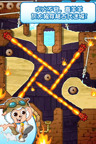 游戏一开始玩家要加紧速度,将水引到一个自己建立的凹槽内之后再利用一些水帮助植物生长起来,之后利用火苗一举消灭植物。打通之前预存的水,让水流入水管入口处,之后就是成功帮助喜羊羊过关。