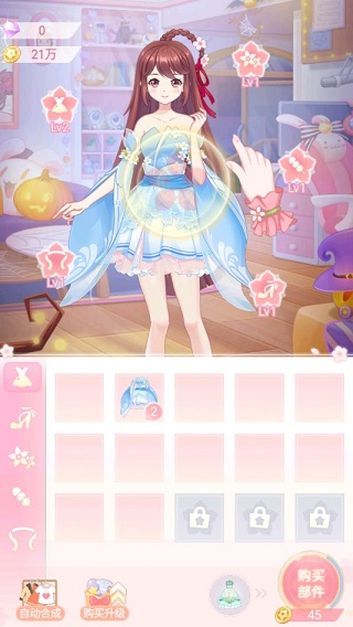 偶像的第一要务,就是打扮的美美哒!现在开始,先来购买一件漂亮的衣服为花小楼穿上,具体的操作方面,可在主界面点击“合成”,然后通过“购买部件”来实现相同服装的合成,每两件相同的服装可以合成出更高级的服装部件。接着拖动部件到花小楼的身上即可。