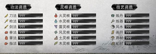 最大功法、灵根、技艺:各种资质999