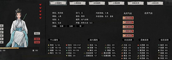 3、数值属性:抗性大多50%,功法灵根资质200,技艺资质800。