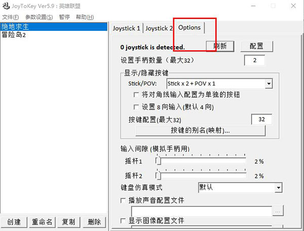 4、点击options可以设置手柄数量、显示/隐藏按键、按键别名等。