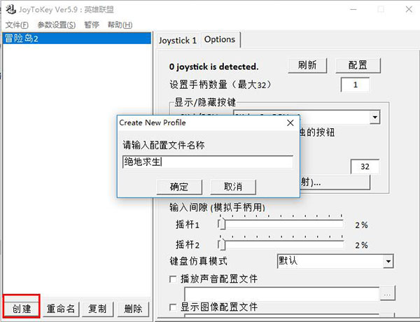 joytokey1、运行EXE文件打开软件,软件默认创建了一个冒险岛游戏,点击左下角创建,创建新的游戏配置,比如绝地求生。