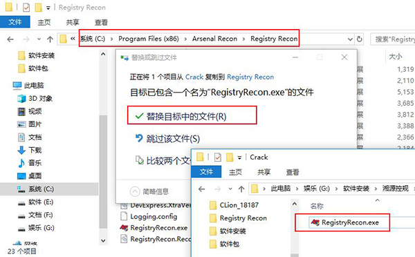 6、安装完成后将破解补丁复制到安装目录下替换原文件,一般默认安装目录为C:Program Files (x86)Arsenal ReconRegistry Recon