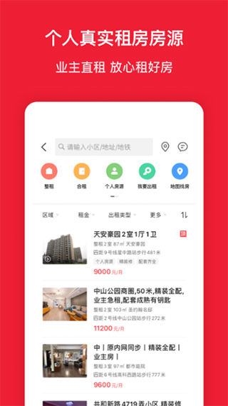 支持区域、价格、类型、户型等多维度搜索和综合搜索。