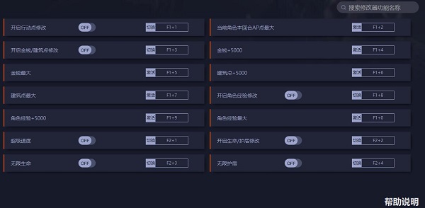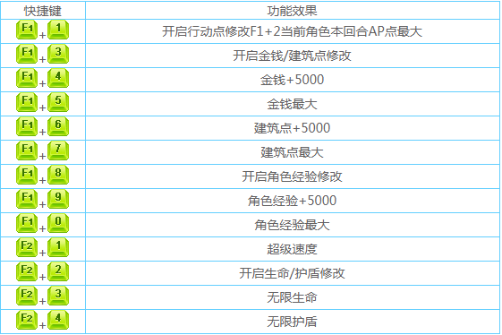 F1+1开启行动点修改F1+2当前角色本回合AP点最大F1+3开启金钱/建筑点修改