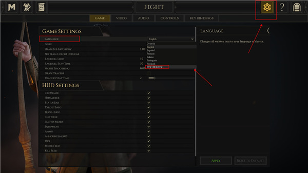 4、依次选择“GAME”--->“LANGUAGE”--->“简体中文”,随后点击APPLY,就可以将游戏设置成中文了;