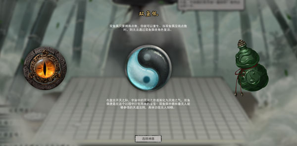 在游戏开局有三个可选的神器,分别为:昊天眼,双鱼佩,炼妖壶。昊天眼