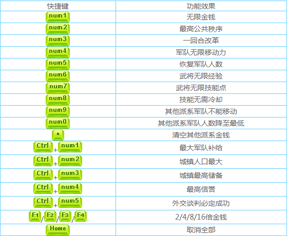 1. “最高公共秩序”激活后,点击城市时该城市的公共秩序会变为99。2. “军队无限移动力”、“恢复军队人数”、“其他派系军队不能移动”、“其他派系军队人数降至最低”等功能在大地图中生效,并不在战斗中生效。如果需要快速赢得战斗,可以先把其他派系军队人数降至最低再进行战斗。