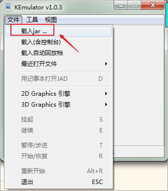 2、进入ke模拟器软件主界面,然后直接点击左上角的“文件”选择“载入jar...”,如下图;