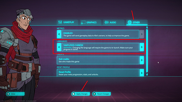 5、选择OTHER,找到ANGUEGES选项,向左两次到简中,点击APPLY CHANGES就可以将游戏设置为中文。