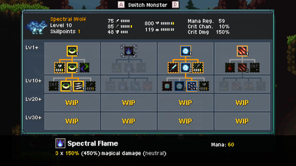 1.怪物避难所结合怪物收集、回合制战斗和类似地牢探索的元素。你遇到的任何怪物都可以成为你自己团队的一部分。这些怪物在战斗中提供了很多战术选择,或者让你克服某些障碍去探索新的领域。2.每个怪物都有独特的技能树。这可以让你自定义你的怪物来追求不同的策略。喂食和装备你的怪物以改善他们的统计数据,进一步强化。