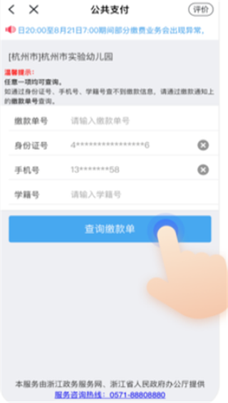3、选择所在地区及对应学校,输入学生身份证号或缴款单号等,查询缴费通知单;