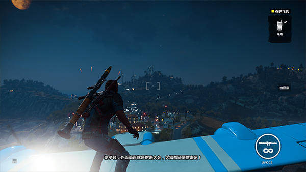 7、进入游戏后的第一个任务就是保护飞机,使用自带的火箭筒摧毁地面上的敌人;