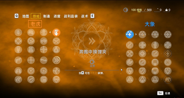 技能树主要分为两系,左边橙色的“虎系”的主要是杀敌以及攻击类的技能,而右边蓝色的“象系”则是侧重体力以及恢复类的技能,玩家可以根据自己的需要来点出相应的技能
