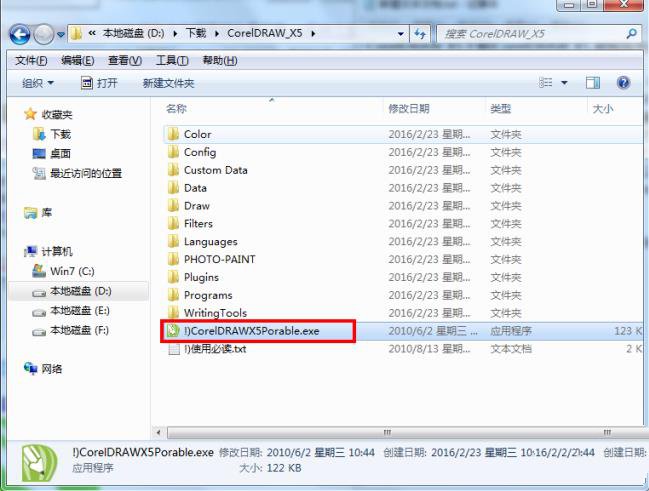 1、解压缩后,打开文件夹,运行“!)CorelDRAWX5Porable.exe”开始安装