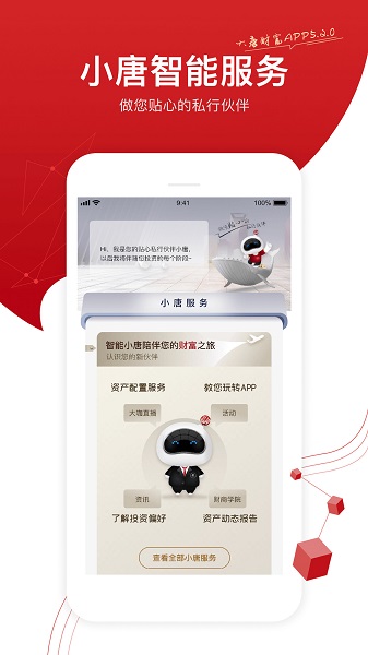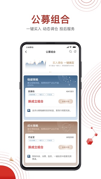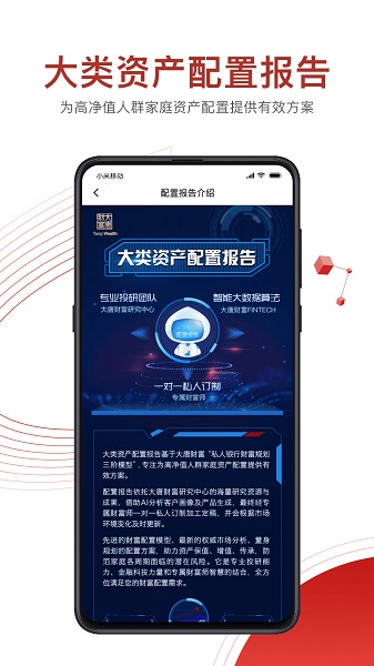 3、app提供专业投资建议,量身打造资产配置解决方案,分散投资风险,力求实现财富的长期增值。