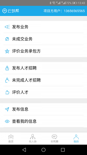 1、项目方用户指拥有项目的开发公司,一般是房地产开发项目的甲方,例如:开发商、工厂业主等。项目方用户可以在平台上寻找承包方用户,对项目的开发进行合作;项目方用户亦可在平台上寻找招聘员工(即个人用户);