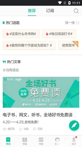 1、这款阅读app可以添加自己喜欢阅读的标签。2、参与免费得书活动可以获取免费的电子书籍。