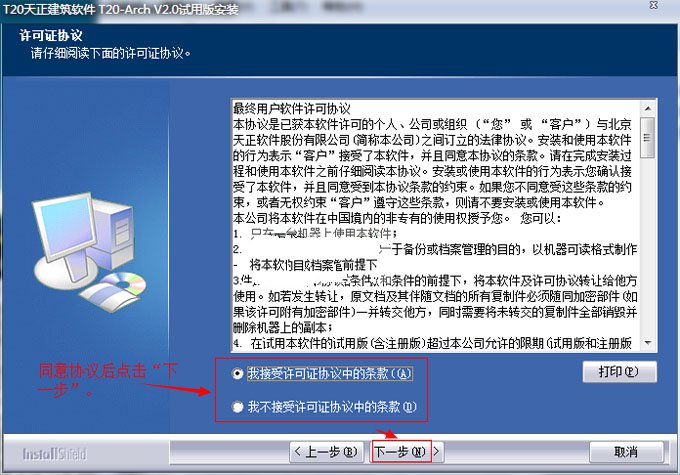 天正建筑20161.安装这款软件之前,先安装对应版本的AutoCAD,然后再启动安装程序。在协议页面中选择同意协议,点击“下一步”。
